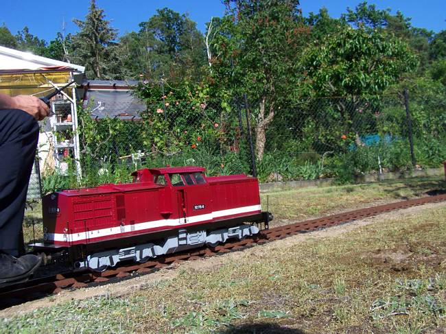 Immer zu Himmelfahrt wird auf die private Anlage der Brüder Claußnitzer in Coswig bei Radebeul geladen. Auch 2019 durfte ich mit zu den Gästen zählen. Wir hatten dort einen tollen Fahrtag, natürlich auch einige mit Echtdampf. Auf dem über 500 Meter langen Grundstück sind die Gleise wie ein mehrfacher Knochen verlegt. Vorn ist einen Wendeschleife, im eingleisigen Abschnitt befindet sich der 3-gleisige Bahnhof mit Lokschuppen und Abstellgruppe. Im hinteren Teil gibt es eine Wendeschleife mit 3 Gleisen als Abstellraum und eine weitere hintere Schleife mit Anheizgleis, die hinten nochmals über die vordere Schleife erreichbar ist und vorn am eigentlichen Gleisdreieck mittels Kreuzung so miteinander verwoben sind, dass man ewig im hinteren Bereich seine Runden drehen könnte, ehe man wieder vor über die Teichbrücke zu Bahnhof fährt. Highlight der großen Schleife ist der über 20m gemauerte Viadukt. Seit 2020 ist auch das Umfahrungs- und Abstellgleis von der vorderen Schleife bis hinter den Bahnhof fertiggestellt, so dass der eingleisige Abschnitt geschickt umfahren werden kann.