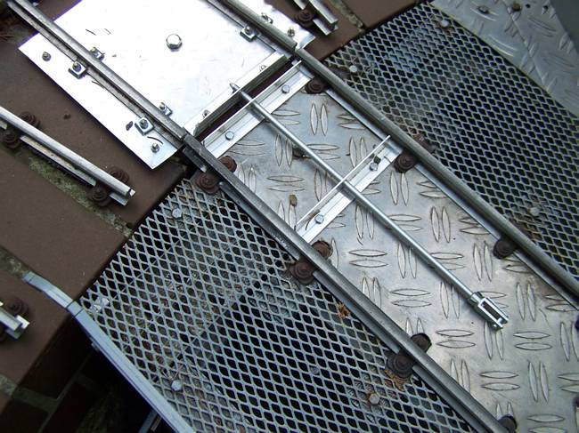 Es wurde noch eine zweite Geländerebene eingesetzt, da dies besser aussieht. Die Montage der Rollen gestaltete sich schwieriger. 5 Rollen in Waage zu bringen, war nicht einfach. Nach dem Belastungstest stellte ich fest, das der Gummi nachgibt. Daher wurden die Rollen noch mit einem Blechprofil ummantelt. Die Abdeckbleche der Fahrebene wurden in zwei Versionen erstellt. Innerhalb des Gleises wurde ein Vollblech eingebracht. Da es genau auf den Schwellen liegen sollte, musste für jede Gleisschraube eine Aussparung gebohrt werden. So auch bei den Außenblechen. Diese bestehen aber aus Streckmetallzaunelementen, die außen ebenfalls mit überschüssigen Schwellen auf Höhe fixiert wurden. Die dreieckige Erweiterung für das Drehscheibenhäuschen wurde wieder mit Vollblech ausgelegt. Das Häuschen wurde aus einfachen Blech gefertigt, aus dem meine Schilder sind. Das Skelett war wieder das selbe Material, aus dem das Geländer bestanden.